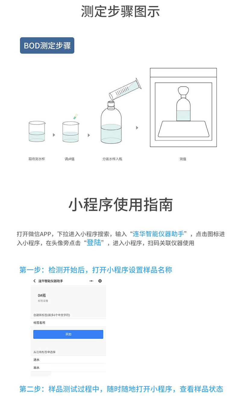 8、 操作簡(jiǎn)便:只需要簡(jiǎn)單的按鍵即可完成設(shè)置,按照量程設(shè)置的體積數(shù)將水樣裝瓶,即可進(jìn)行實(shí)驗(yàn);