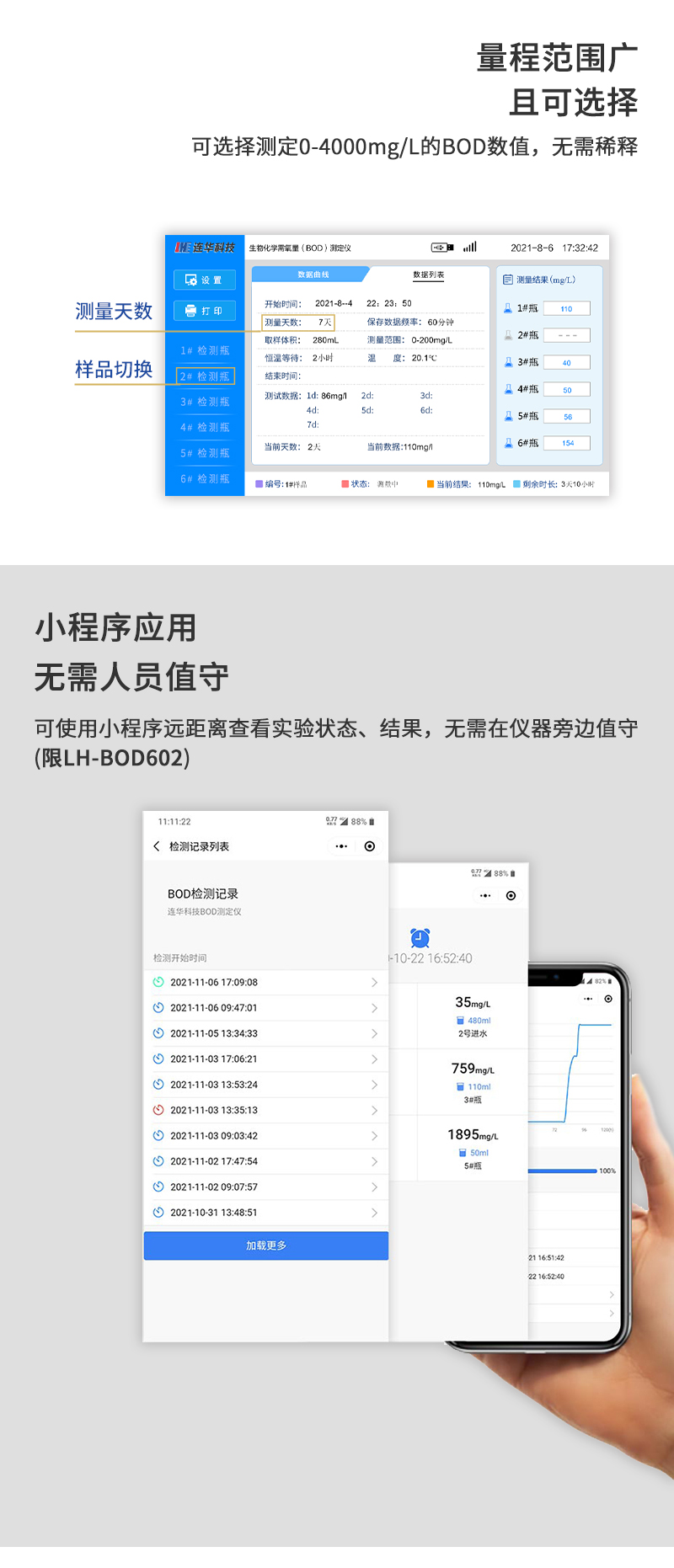 6、 濃度直讀:可以測(cè)量1-6個(gè)樣品,無(wú)需換算、直接顯示BOD濃度值;
